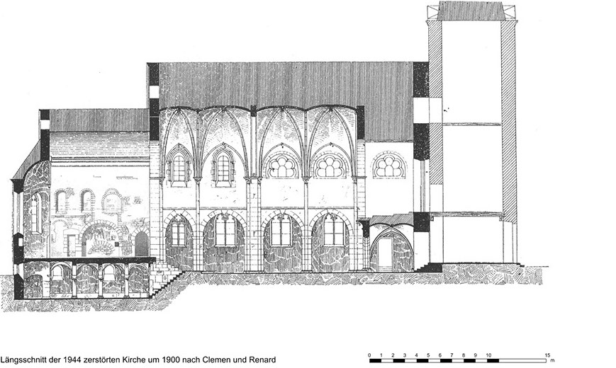 Im Jahre 1953 begann der Wiederaufbau auf der Grundlage einer Neuplanung des Kölner Architekten Karl Band. Ausdehnung und Höhenentwicklung dieses Neubaus orientierten sich am Vorgängerbau. Der Hauptraum ist gegenüber dem früheren Langhaus um 90° gedreht und nach Süden ausgerichtet. Die dem Hauptraum angegliederte Annokapelle über der Krypta fasst die Grundfläche ihrer Vorgängerin und des früheren Chores zusammen. Am Bauplatz des früheren Turmes entstand ein zweistöckiger Sakristeianbau.