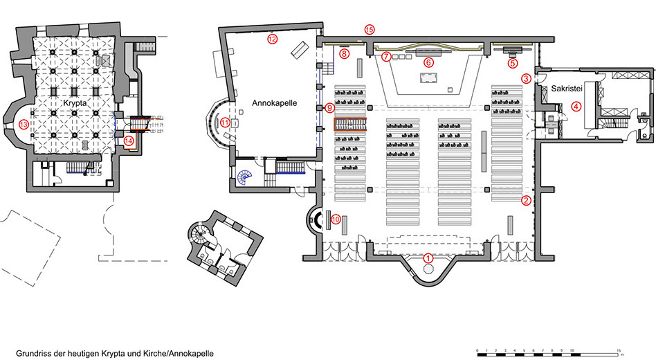 Im Jahre 1953 begann der Wiederaufbau auf der Grundlage einer Neuplanung des Kölner Architekten Karl Band. Ausdehnung und Höhenentwicklung dieses Neubaus orientierten sich am Vorgängerbau. Der Hauptraum ist gegenüber dem früheren Langhaus um 90° gedreht und nach Süden ausgerichtet. Die dem Hauptraum angegliederte Annokapelle über der Krypta fasst die Grundfläche ihrer Vorgängerin und des früheren Chores zusammen. Am Bauplatz des früheren Turmes entstand ein zweistöckiger Sakristeianbau.
