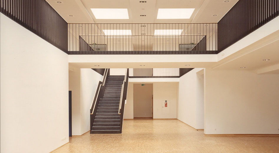 Die Anbindung wurde so gestaltet, dass die natürliche Belichtung des Bestandsgebäudes gewährleistet ist. Der zweibündige Neubau ist geprägt durch eine großzügige, zweigeschossige Erschließungshalle, die multifunktional genutzt werden kann. Raumhohe Verglasungen in den Klassenräumen schaffen sowohl eine sehr gute natürliche Belichtung, als auch einen freien Blick in die umgebende Landschaft.