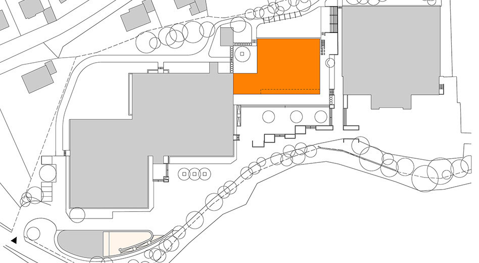 Der Schulerweiterungsbau fügt sich in die bestehende Situation zwischen Schulgebäude und Turnhalle ein, und definiert gemeinsam mit diesen bestehenden Bauten eine neue, räumlich klar gefasste Schulhofsituation. Ein eingeschossiger, transparenter Baukörper verbindet das bestehende, dreigeschossige Schulgebäude mit dem zweigeschossigen Erweiterungsbau.
